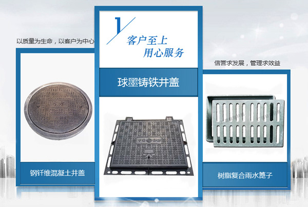 • 樹脂復合圓井蓋 樹脂復合方井蓋 樹脂復合雨水篦子 樹脂復合溝蓋板 樹脂復合電纜溝蓋板 樹脂復合樹池篦子及植草井 球墨鑄鐵圓井蓋 球墨鑄鐵方井蓋 球墨鑄鐵篦子及溝蓋板 不銹鋼井蓋及蓋板 PE檢查井系列 波紋管及中空壁纏繞管系列 玻璃鋼格柵系列 玻璃鋼標志樁 化糞池 球墨鑄鐵復合井蓋 樹脂排水溝